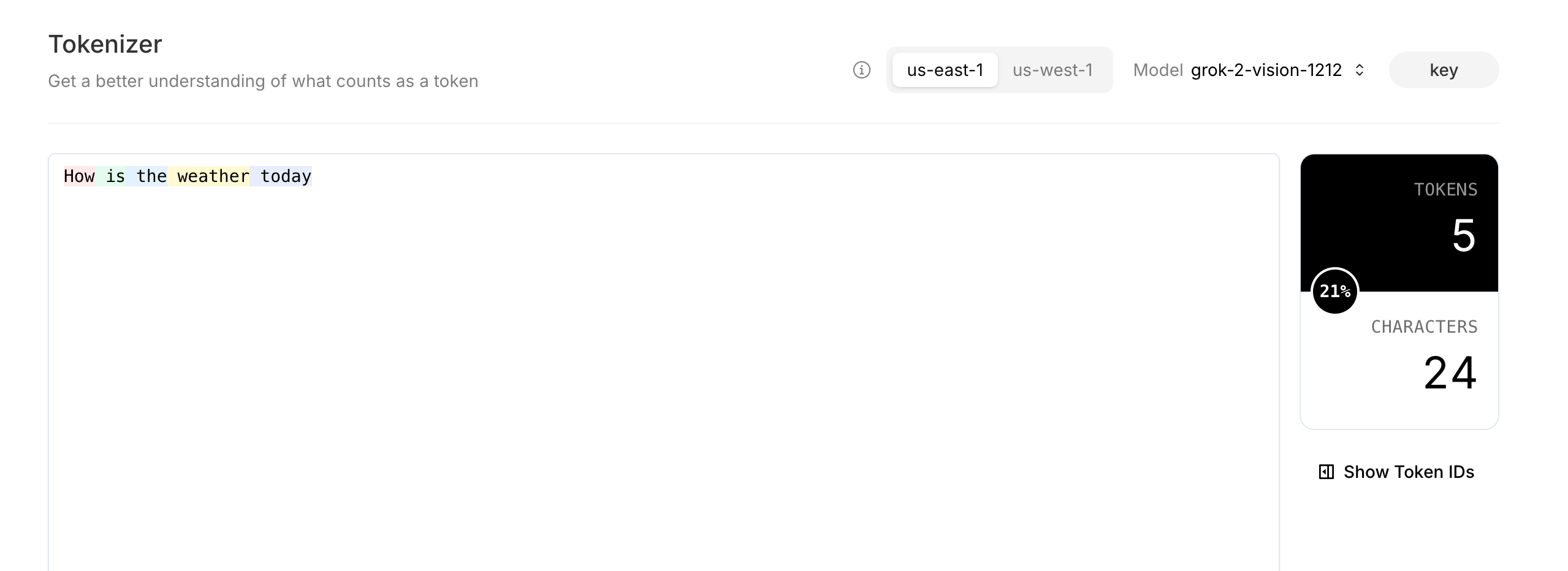 在 xAI 控制台上,您可以使用 tokenizer 页面来估计您的文本提示将消耗多少个令牌。例如,要发送的以下消息grok-2-vision-1212将消耗 5 个代币。